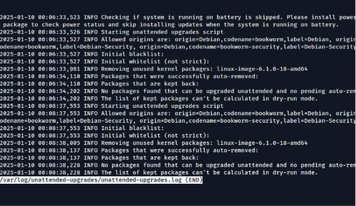 sudo less /var/log/unattended-upgrades/unattended-upgrades.log