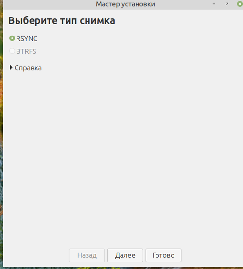 Тут основное вам нужно выбрать тип снимков. BTRFS - это файловая система, под которую нужно иметь диск форматированный в нее, да, там есть свои плюсы. Но у обычного пользователя ее нет, все диски в ext4