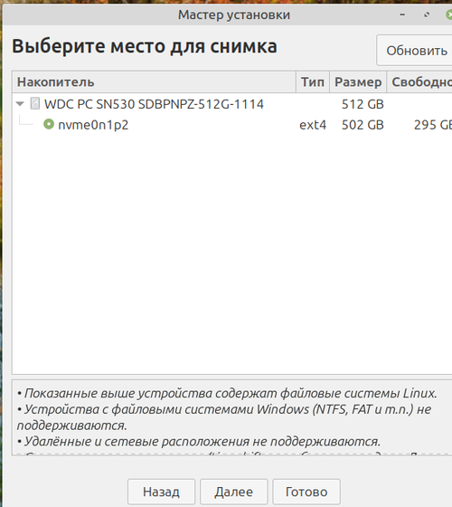 Снимки имеют большой размер, поэтому желательно хранить их на другом диске или разделе. По умолчанию снимки сохраняются в системном (корневом) разделе в /timeshift, также можно выбрать другие разделы Linux.