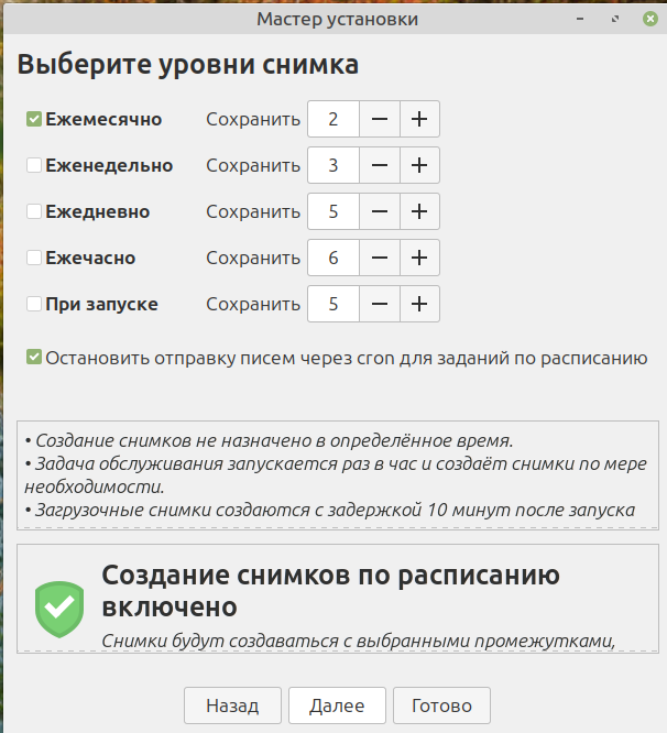 На вкладке «Расписание» можно выбрать несколько уровней создания снимков (ежемесячно, еженедельно, ежедневно, ежечасно, при загрузке) и указать количество сохраняемых снимков для каждого уровня: