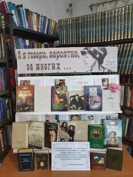 Библиотека: Отдел обслуживания МБУК «МЦРБ» Тип выставки: тематическая, внутрибиблиотечная. По времени действия: с 14 по 30 июня Читательское назначение: для всех групп читателей. Целевое назначение: познакомить читателей с жизнью и творчеством поэта Анны Андреевны Ахматовой Оформление выставки: книги, иллюстрации, журналы Месторасположение выставки: читальный зал библиотеки. Эффективность выставки: заинтересовала все категории читателей. Средство рекламы: в соц. сетях «В Контакте» в группе «Библиотека им. Лермонтова». Просмотрело выставку: 5 читателей, просмотр продолжается.