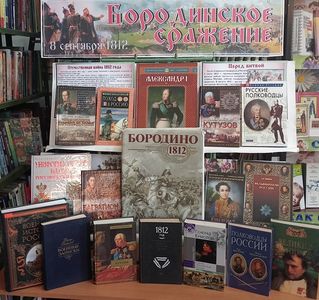 Библиотека: Отдел обслуживания МБУК «МЦРБ». Тип выставки: тематическая, внутрибиблиотечная. По времени действия: выставка организована с 4 по 30 сентября. Читательское назначение: для всех групп читателей. Целевое назначение: познакомить пользователей с историей Бородинской битвы – решающего сражения Отечественной войны 1812 года. Месторасположение выставки: читальный зал библиотеки. Эффективность выставки: заинтересовала все категории читателей. Средство рекламы: информация о выставке на библиотечном сайте, соц. сети «ВКонтакте». Цитата: «Умолкшие холмы, дол некогда кровавый! Отдайте мне ваш день, день вековечной славы, И шум оружия, и сечи, и борьбу!»