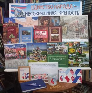 Библиотека: Отдел обслуживания МБУК «МЦРБ». Тип выставки: тематическая, внутрибиблиотечная. По времени действия: выставка организована с 1 по 15 ноября. Читательское назначение: для всех групп читателей. Целевое назначение: привлечь внимание пользователей к государственному празднику – Дню народного единства; развивать патриотические чувства, чувство долга и ответственности за судьбу своей Родины; воспитывать чувство гражданственности; прививать интерес к историческому прошлому своей страны; воспитывать дружеские отношения, толерантность. Месторасположение выставки: читальный зал библиотеки. Эффективность выставки: заинтересовала все категории читателей. Средство рекламы – размещена в соц. сети «В Контакте».