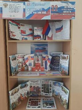 Оформление выставки: книги (15 экз.), стихотворение, флаг, детские рисунки.