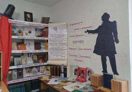 Оформление выставки: книги, журналы, цитаты, фотоальбом, портрет Пушкина.