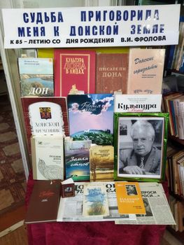 Библиотека: Отдел обслуживания МБУК «МЦРБ» Тип выставки: тематическая, внутрибиблиотечная. По времени действия: выставка организована с 1 по 16 февраля Читательское назначение: для всех групп читателей. Целевое назначение: познакомить читателей с жизнью и деятельностью донского поэта Владимира Иосифовича Фролова Оформление выставки: книги, иллюстрации, журналы, артобъекты Месторасположение выставки: читальный зал библиотеки. Эффективность выставки: заинтересовала все категории читателей. Средство рекламы: в соц. Сетях «В Контакте» в группе «Библиотека им. Лермонтова». Просмотрело выставку: 9 читателей, просмотр продолжается. Выдано: 5 экземпляров книг.