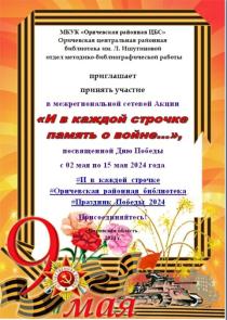 Марьевская сельская библиотека присоединилась к Межрегиональной сетевой акции «И в каждой строчке память о войне…» Организатор Акции: отдел методико-библиографической работы Оричевской центральной районной библиотеки им. Л. Ишутиновой МКУК «Оричевская районная ЦБС» Кировской области.