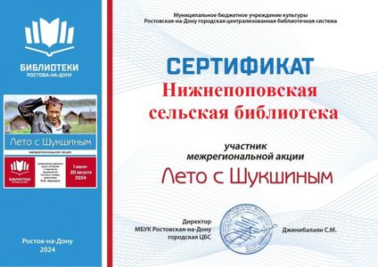 «Лето с Шукшиным» Нижнепоповская сельская библиотека присоединяется к акции «Лето с Шукшиным». Организатор акции: МБУК Ростовская-на-Дону городская ЦБС (Библиотека имени В.М. Шукшина).
