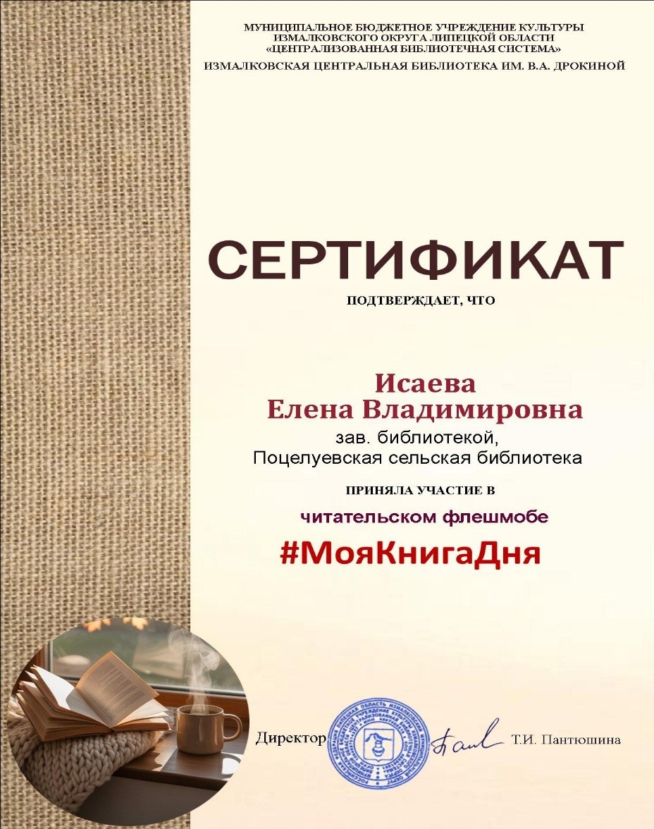 Читательский флешмоб «#МояКнигаДня» Поцелуевская сельская библиотека принимала участие в читательском флешмобе «#МояКнигаДня». Организатор флешмоба Измалковская центральная библиотека имени В. А. Дрокиной МБУК ЦБС Измалковского округа Липецкой области. https://vk.com/wall-226701164_155