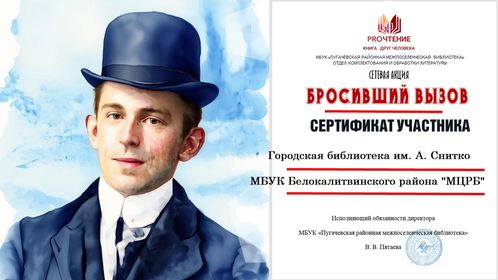 Сетевая акция «Бросивший вызов» Городская библиотека им. А. Снитко присоединяется к сетевой акции «Бросивший вызов». Организатор акции: отдел комплектования и обработки литературы МБУК «Пугачевская районная межпоселенческая библиотека».
