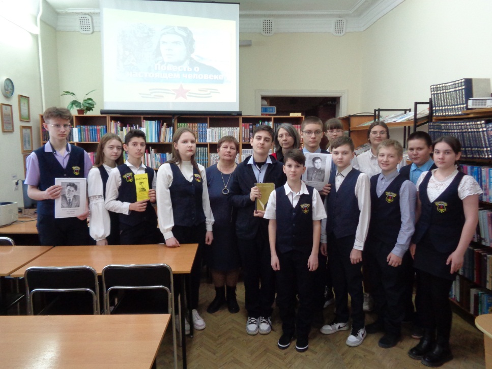 В этом году исполняется 115 лет со дня рождения Бориса Николаевича Полевого, автора «Повести о настоящем человеке». Это одно из лучших произведений на тему Великой Отечественной войны. 15 марта в Отделе по работе с детьми для учащихся 7 «В» класса школы №2 прошла читательская конференция по книге Бориса Полевого «Повесть о настоящем человеке». Библиотекарь Медведева Т.А. познакомила читателей с биографией писателя, рассказала о журналистской деятельности Б. Полевого, познакомила с его книгами. В ходе мероприятия школьники услышали историю написания произведения «Повесть о настоящем человеке», познакомились с главным героем книги, Алексеем Мересьевым и его прототипом, прослушали отрывки из повести. Семиклассники поделились впечатлениями о книге, обсудили понравившиеся эпизоды, ответили на вопросы: «Каков в их понимании настоящий человек?», «Чему научила их повесть и над чем надо задуматься?» и другие. Мероприятие закончилось просмотром художественного фильма «Повесть о настоящем человеке».