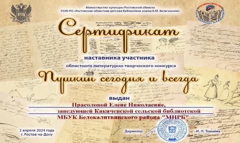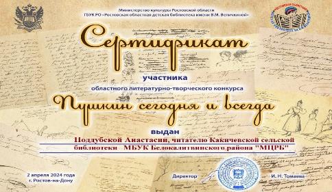 Областной литературно-творческий конкурс «Пушкин сегодня и всегда» Юный читатель Какичевской сельской библиотеки Поддубская Анастасия, приняла участие в ежегодном областном литературно-творческом конкурсе по привлечению детей к чтению "Пушкин сегодня и всегда" Номинация "Книги Пушкина в моей семье."